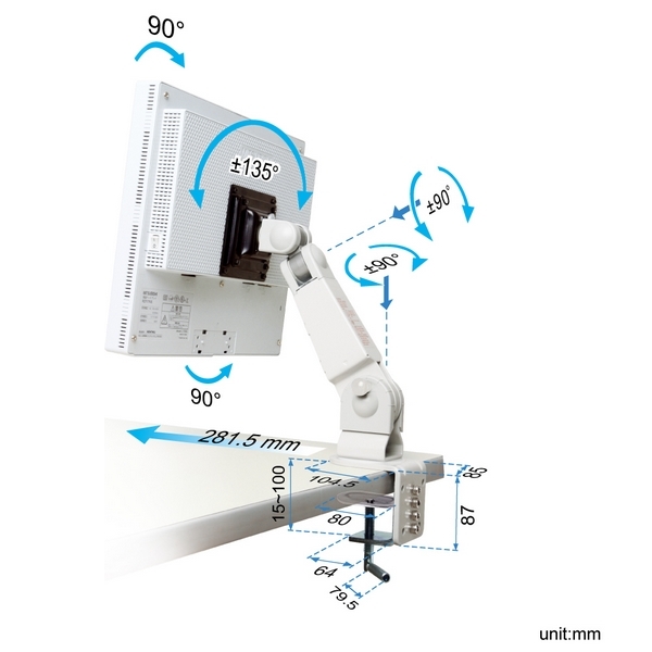 ◆5軸の関節を有しており、画面の位置や角度を自由に調節できます。アーム付け根部の角度調節は、