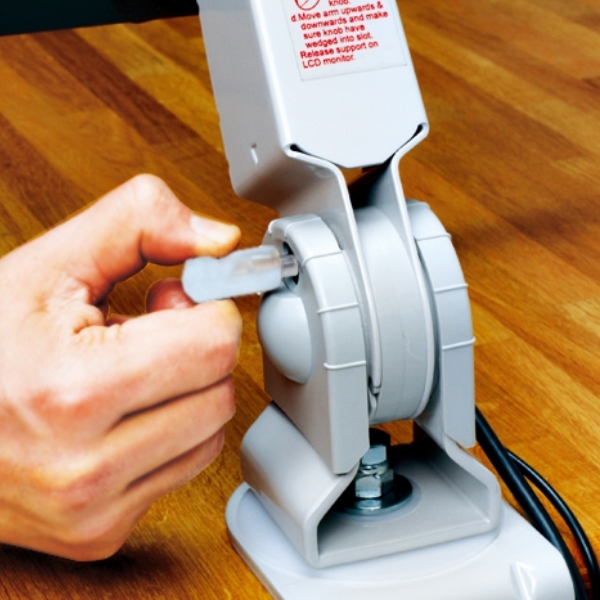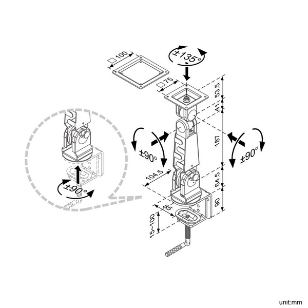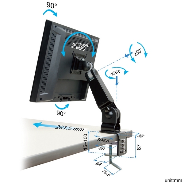 ◆5軸の関節を有しており、画面の位置や角度を自由に調節できます。アーム付け根部の角度調節は、