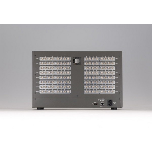 RS-232C またはLAN(10BASE-T または100BASE-TX)を用いて外部からの通信による制御が可能です。 入力している信号の種類(ビットレート)を検出し、液晶ディスプレイに表示することが可能です。 内部温度およびファン回転状態を液晶ディスプレイにステータス表示することが可能です。 SDI 信号のリクロック機能を有しています。 キーロック機能により前面パネルの押しボタンを無効にし、誤操作を防止することが可能です。 64 パターンのプリセットメモリーを内蔵しており、クロスポイント情報の記憶または読み出しが可能です。プリセットメモリーは電源を切っても半永久的に保持します。 電源を切る直前のクロスポイント情報を含む各種設定をラストメモリーとして半永久的に保持します。 付属の電源ケーブルはロック機構付。 EIA19型6Uラックマウントに対応しています。 |