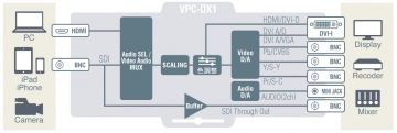 2種類のビデオ入力(3G/HD/SD-SDI/HDMI)と7種類のビデオ出力(コンポジット(CVBS)/S-Video/コンポーネント(YCbCr)/HDMI/DVI-D/DVI-A/VGA)に対応しており、ビデオ入力を任意の出力へ変換できます。アナログビデオ、デジタルビデオの代表的なインタフェースをすべてカバーしています。 不平衡アナログ・オーディオの出力レベルを-30dBu~24dBuの範囲で0.5dBu刻みで調整可能です。 本体DIPSWにより入力・出力インタフェース選択、出力フォーマット選択が可能です。 その他の設定はBoxCenterによりWindowsパソコンから設定をすることが可能です。(DIPSWモードの場合、DIPSWの設定に従い起動し、USBモードの場合BoxCenterからの設定に従い起動します) フレームレート変換(59.94Hzから60Hzへ変換など)に対応しています。 HDMIオーディオは出力は最大8ch(LPCM)に対応しています。1ch、2chはアナログ・オーディオ端子から同時出力されますのでスピーカ等でモニタ可能です。 バッテリー駆動に対応しています。(対応アダプター:Vマウントアダプター,Lマウントアダプター, パワータップアダプター) RoHS指令準拠 ご注意) 本機の入出力クロックはは非同期ですので、原理的にフレームの重複、欠落が発生します。アンシラリデータ等の伝送はできません。オーディオデータは、サンプリングレートコンバータで変換されます。 また最大2フレームの遅延が発生します。 |